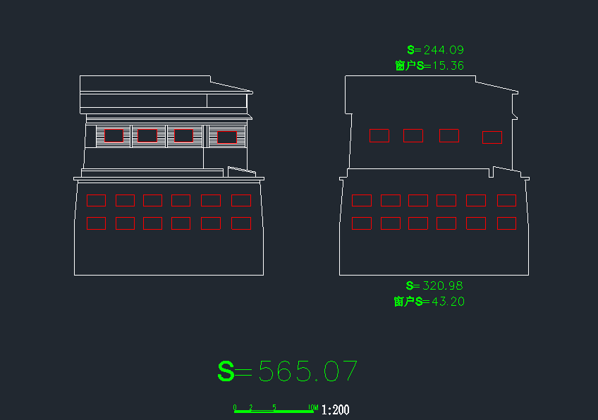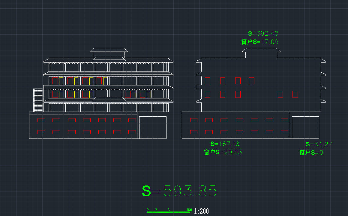 对其建筑立面的总面积和窗户的面积进行统计,为后期的设计方案和造价提供真实可靠的依据