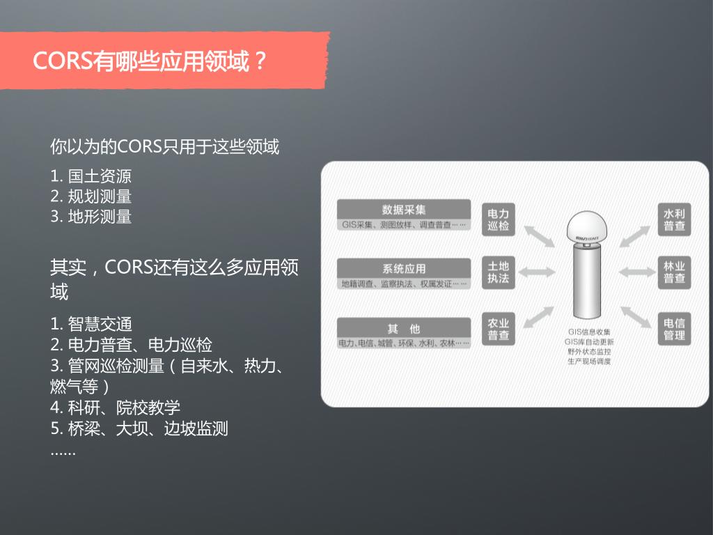 随着现代测绘技术的发展,CORS在全球卫星导航定位系统(GNSS)高精度领域的应用早已不再是什么稀罕事儿,属于测绘从业人员经常念叨的高频词汇。既然CORS是测绘行业的“万人迷”,那么,这次小编就说说与CORS有关的内容。PS:前方高能,有“重磅”PPT内容,敬请耐心阅读。