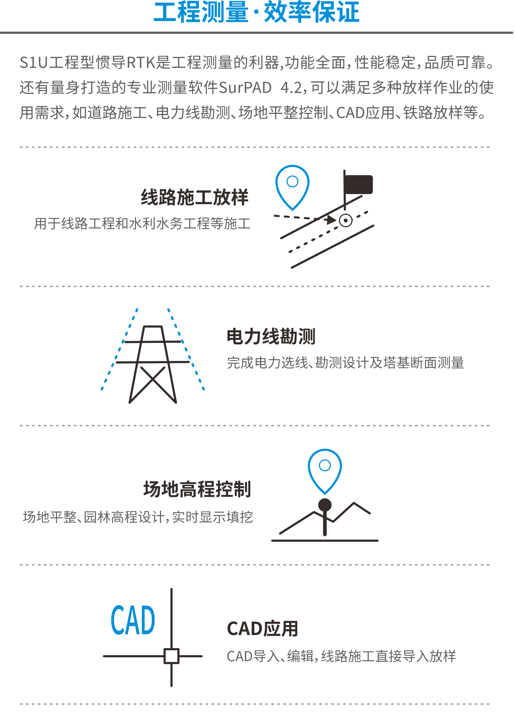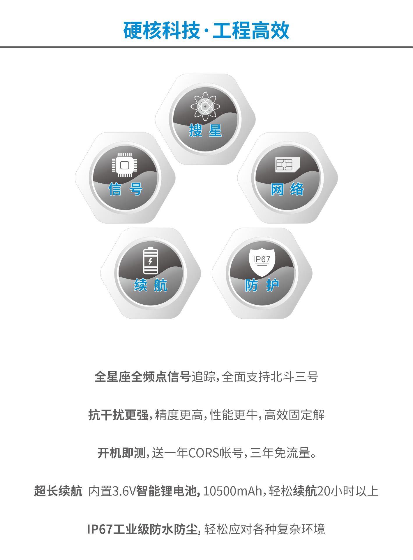 S1U工程型惯导RTK,搭载高性能、高精度定位板卡,全星座全频点信号追踪,全面支持北斗三号;预装思拓力第四代惯导倾斜测量技术,显著提升工程放样效率。