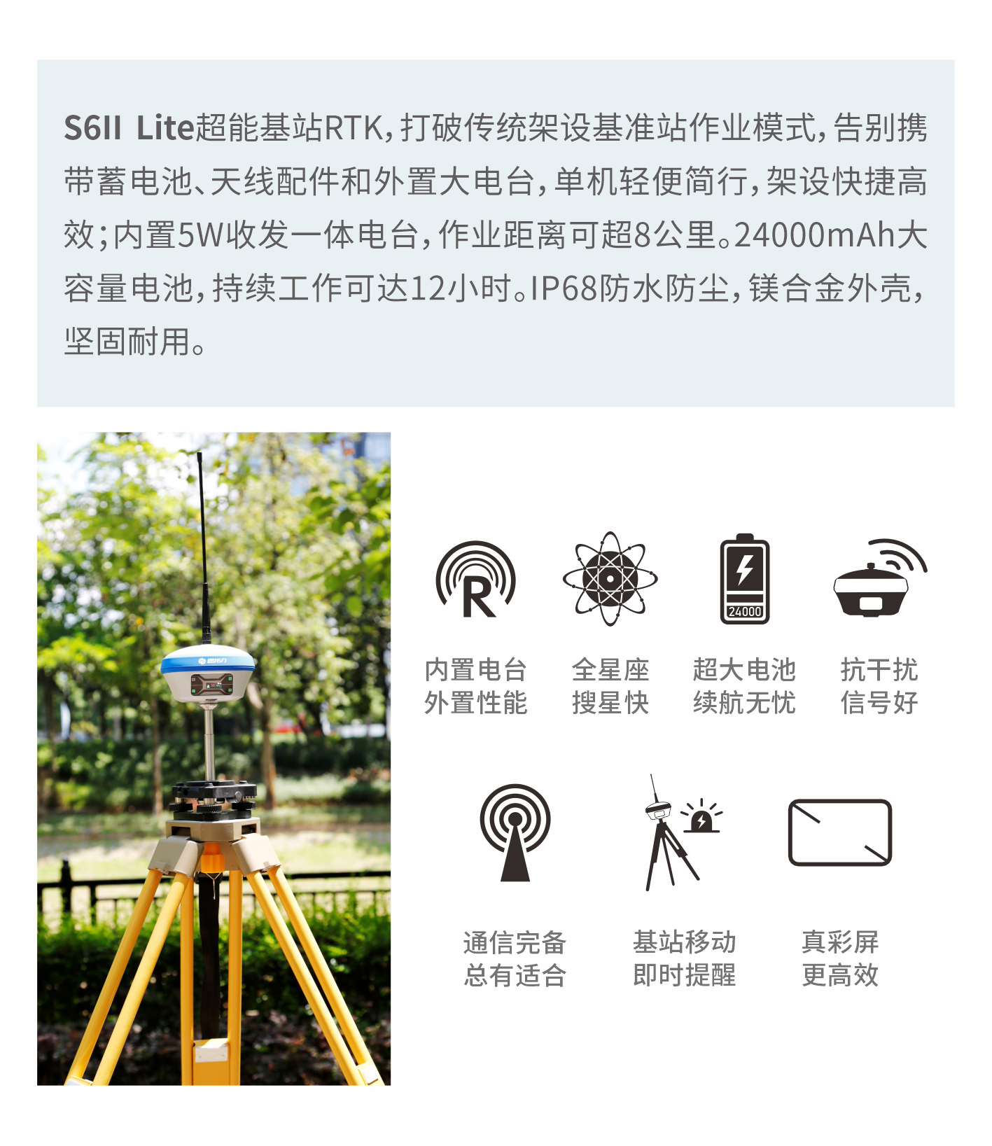 S6II Lite超能基站RTK,打破传统架设基准站作业模式,告别携带蓄电池、天线配件和外置大电台,单机轻便简行,架设快捷高效;内置5W收发一体电台,作业距离可超8公里。24000mAh大容量电池,持续⼯作可达12⼩时。IP68防水防尘,镁合金外壳,坚固耐用。